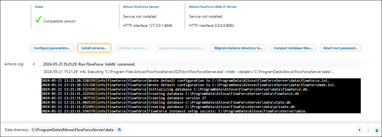 As soon as you have initialized the instance, the current state, logged activities, and various configuration options will appear (screenshot below). The state will inform you about whether the server version is compatible. You will also see information about whether the FlowForce Server and FlowForce Web Server services are installed and running.