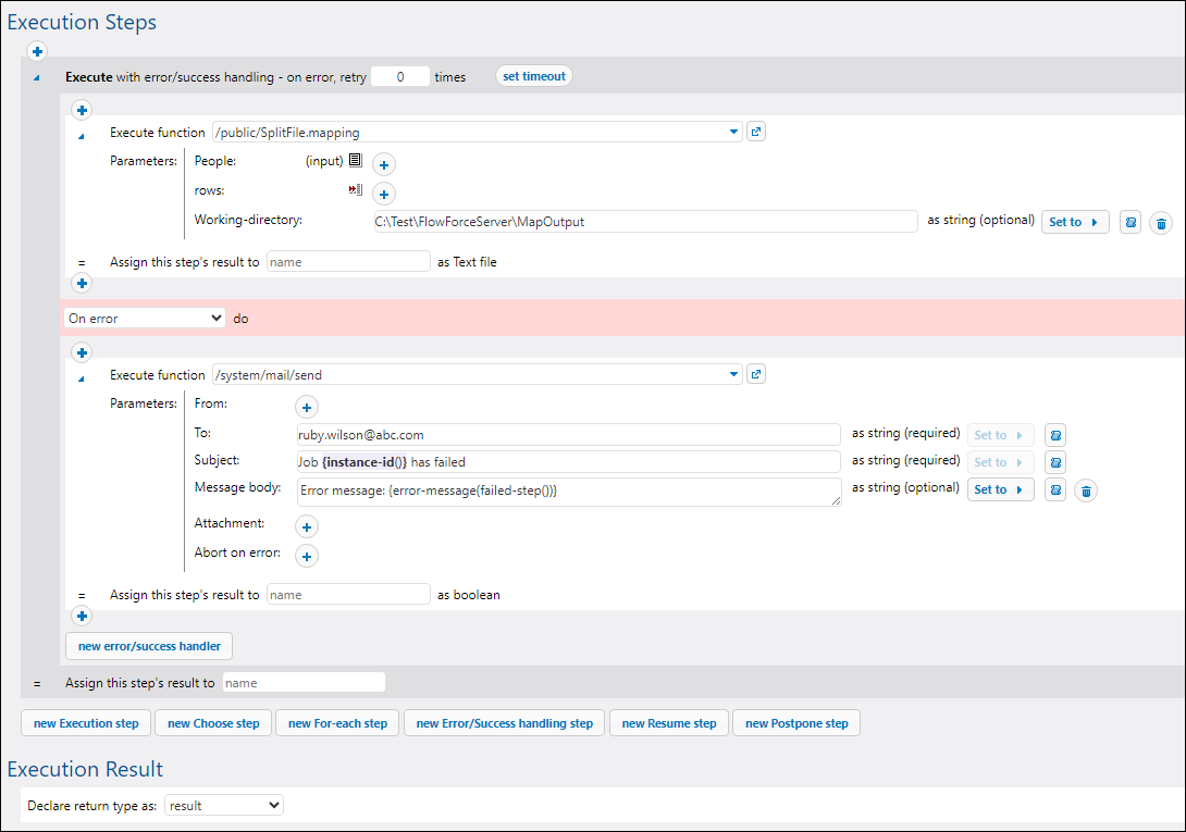 •The return type of a job must be the same as the data type of the last step in the job. Otherwise, FlowForce Server returns an error. To avoid data type-matching errors, use expression functions to change the data type of the last step in the job to the data type declared as the job return type.