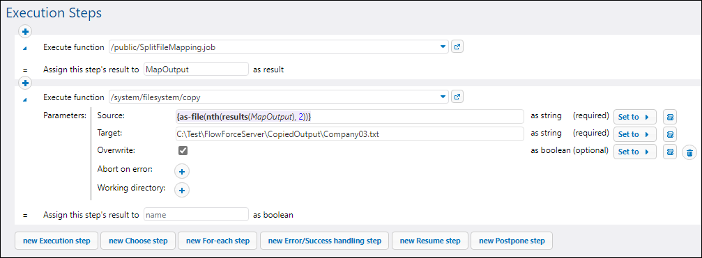 The results function converts the result of the mapping step to a list of result streams. The nth function takes the list of streams as its first argument and selects the third item (the nth function is zero-based). The as-file function creates a file from the stream. The output file called Company03.txt will be saved at the path specified in the Target field. If the target file already exists, it will be overwritten.