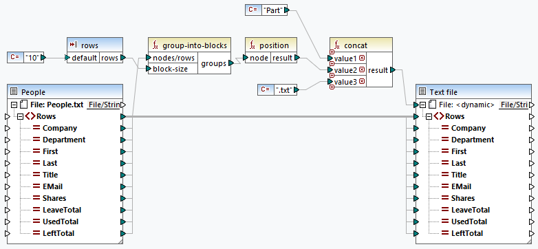 To be able to create a FlowForce job that executes a MapForce mapping, we first need to deploy this mapping to FlowForce Server. See also the MapForce Mapping as a Scheduled Job tutorial for more details. For this example, we have chosen the following mapping that is shipped together with MapForce: MapForceExamples\SplitFiles.mfd (screenshot below). This mapping produces multiple output files, whose names are created dynamically, based on the parameters supplied to the mapping.