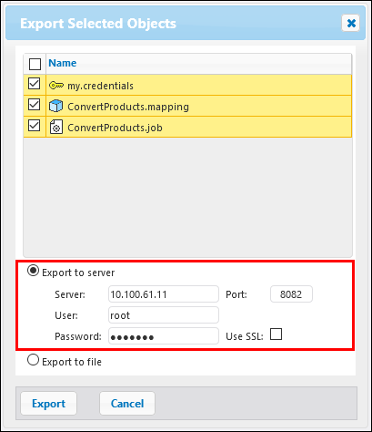 3.In the Export Selected Objects dialog (screenshot below), you can choose to export your configuration data to a running FlowForce Server instance (Export to server) or to a file with a .zip extension. If you switch to the Export to server option (red rectangle below), you will need to enter the host name of the destination FlowForce Server, the port where it runs, the user name and password on the destination FlowForce Server instance, and then click Export.
