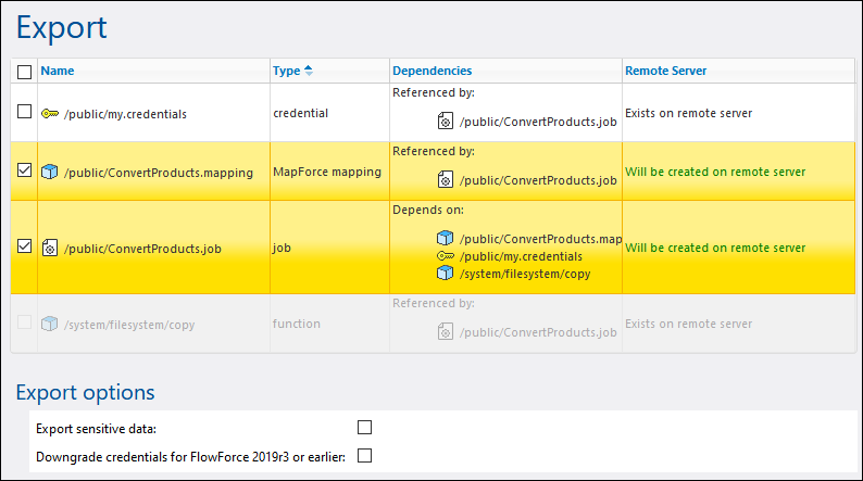 The Downgrade credentials for FlowForce 2019r3 or earlier check box must be selected if the exported list includes records of type credential and if the target FlowForce Server is of version 2019r3 or earlier.