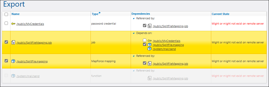 The Remote Server column indicates if the file exists at the destination. If the dependencies already exist at the destination, you can safely exclude such records from the export. Otherwise, if you export records without their dependencies and the dependencies do not exist at the destination, such jobs will likely fail.